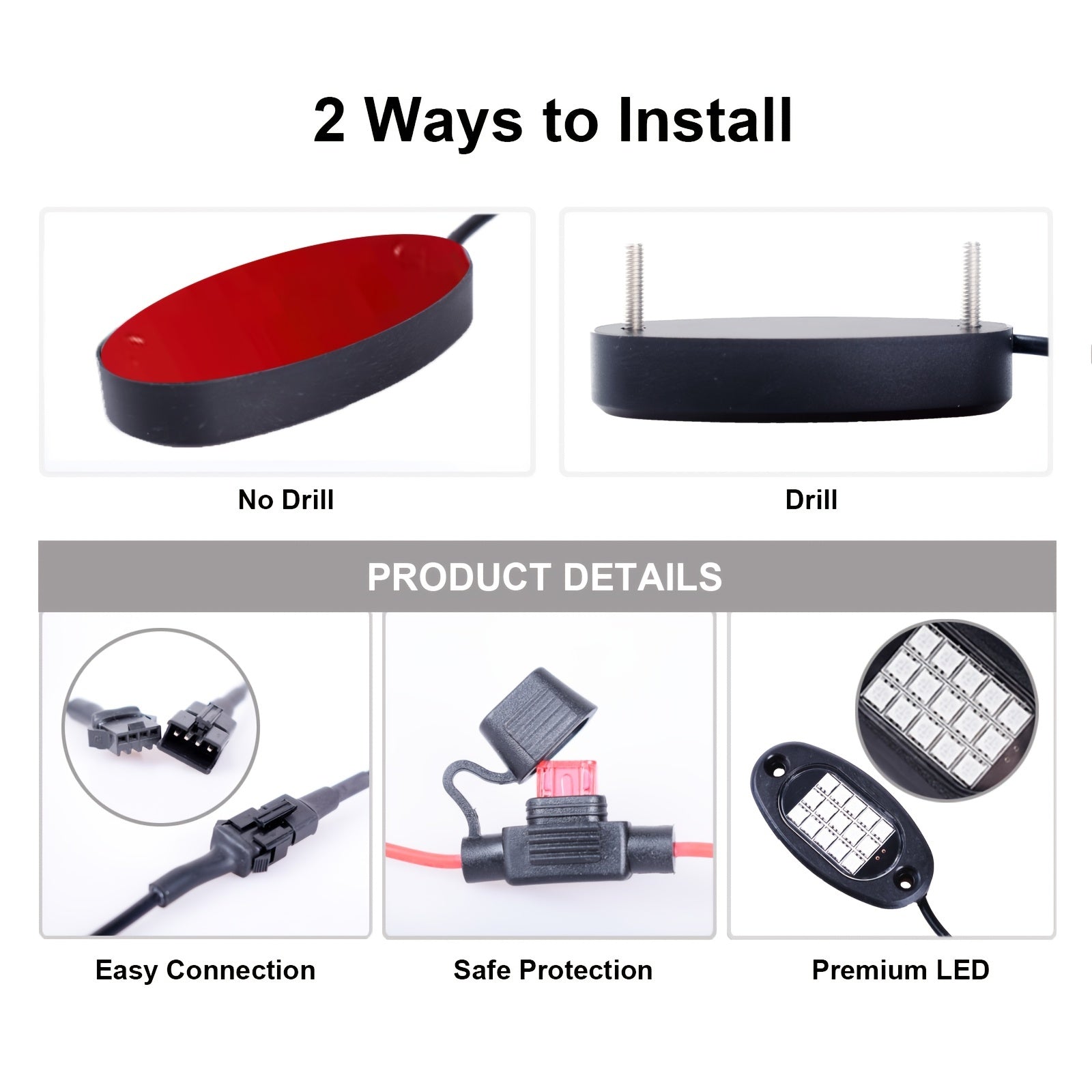 4-Pod Multicolor LED Rock Lights - Vibrant RGB Underglow Neon Lights with APP Control, Music Mode, Waterproof and Adjustable Mounting for Truck, Car, UTV, ATV, SUV, and Jeep