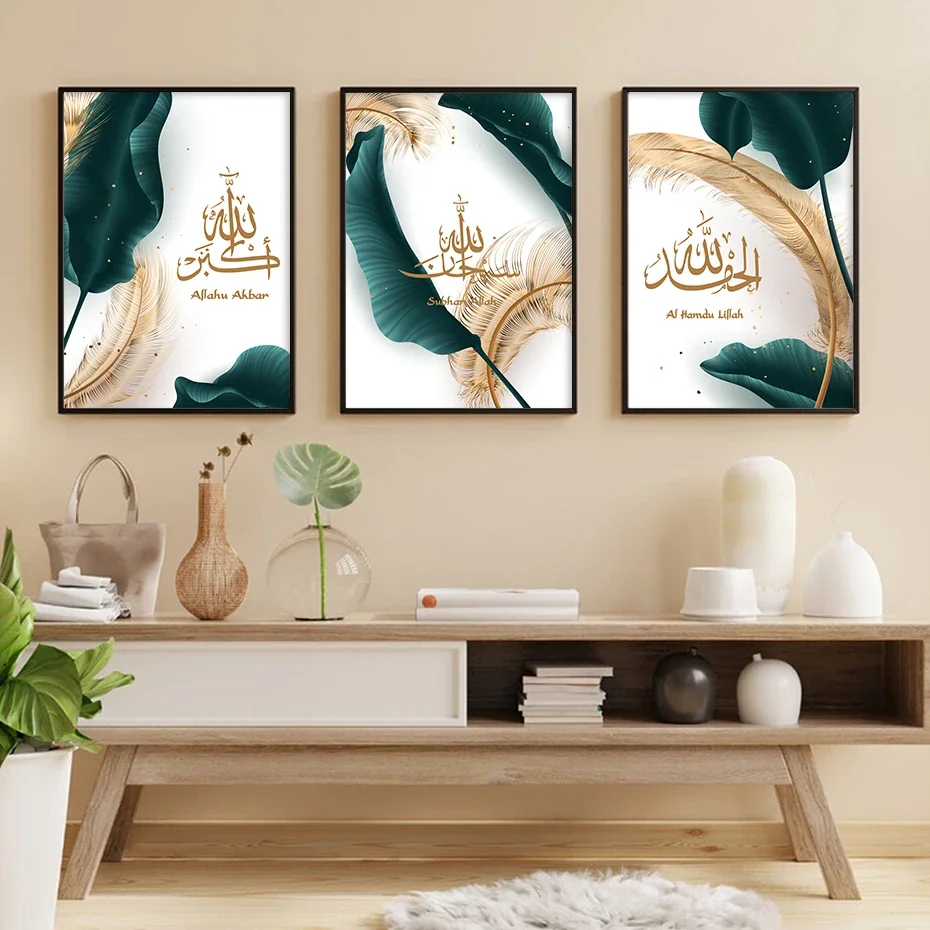 Islamic Arabic Calligraphy Gold Green Leaves Wall Art, Canvas Print Poster, Suitable for, Home, Living Room, Room Decoration