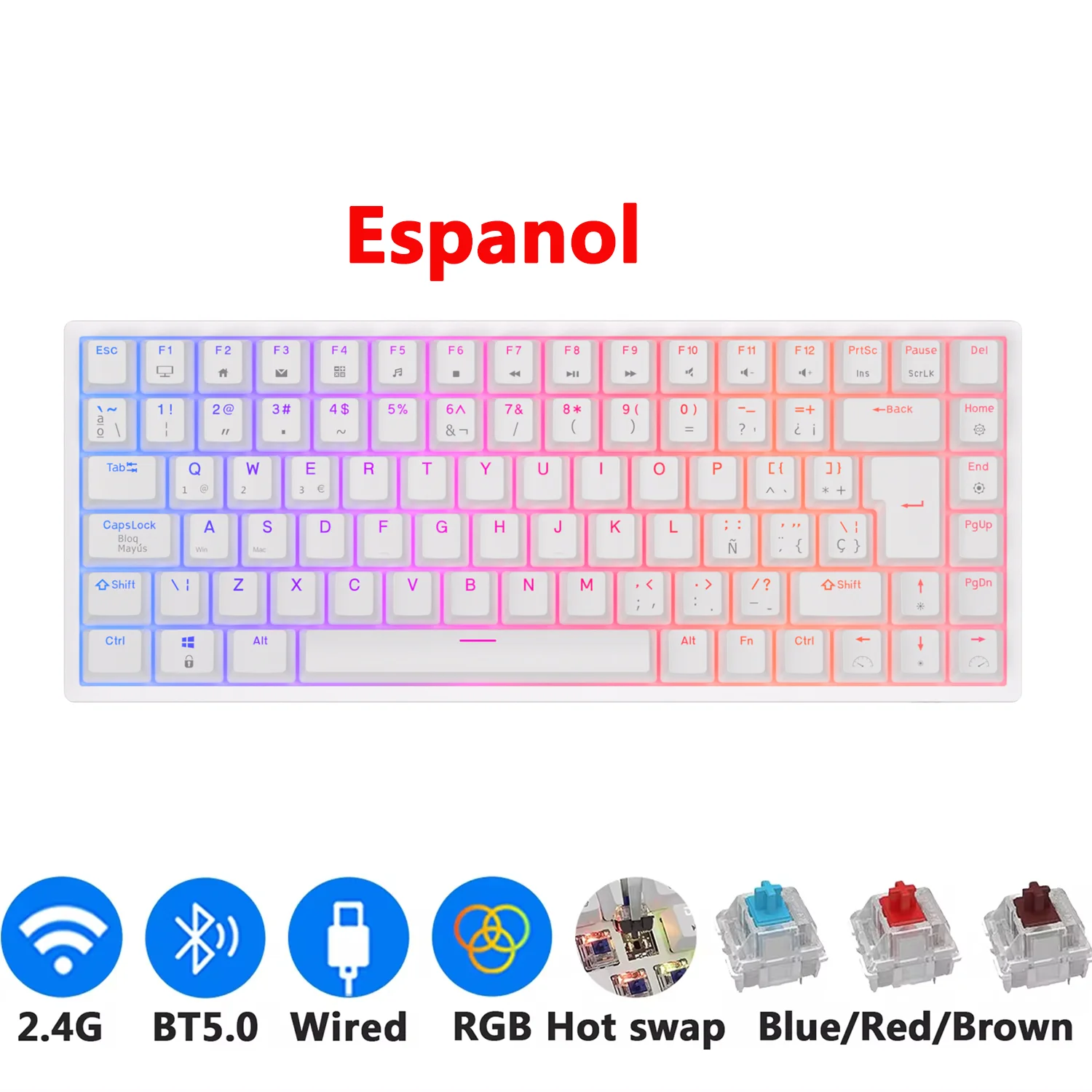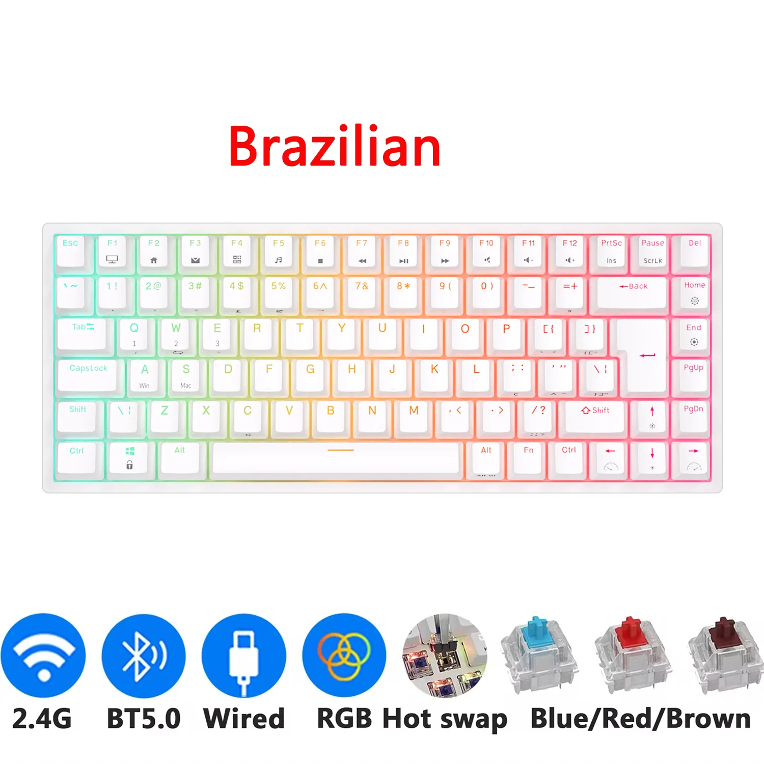 RK84 Royal Kludge Brazilian Wireless Gaming Keyboard 84 Keys RGB Tri-Mode BT5.0/2.4G/Wired Hot-Swappable Mechanical Keyboards