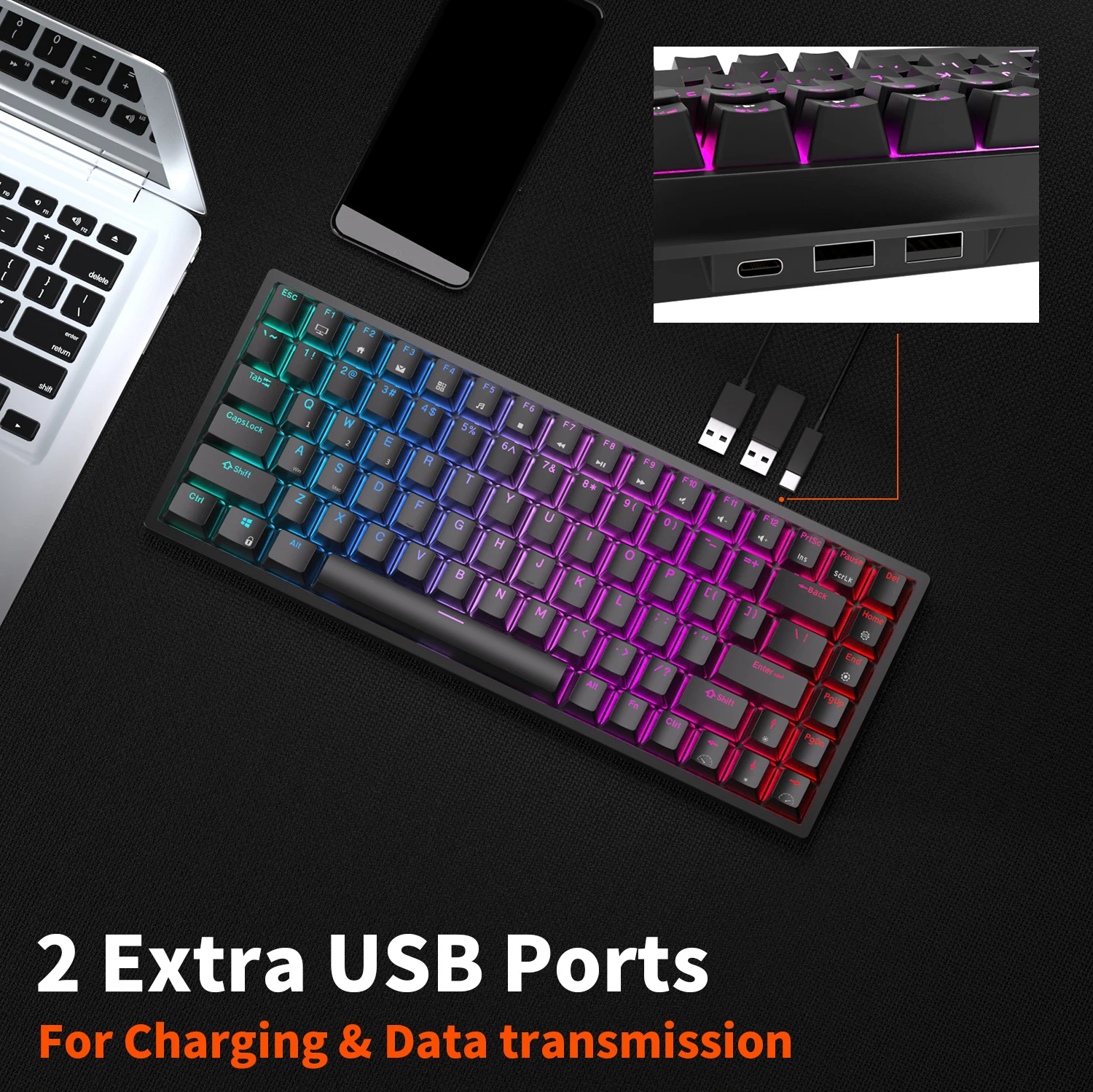 6.Hub Design - This wireless mechanical keyboard is armed with 2 built-in USB pass-through ports and 1 Type-C Port, allowing to back up more facilities