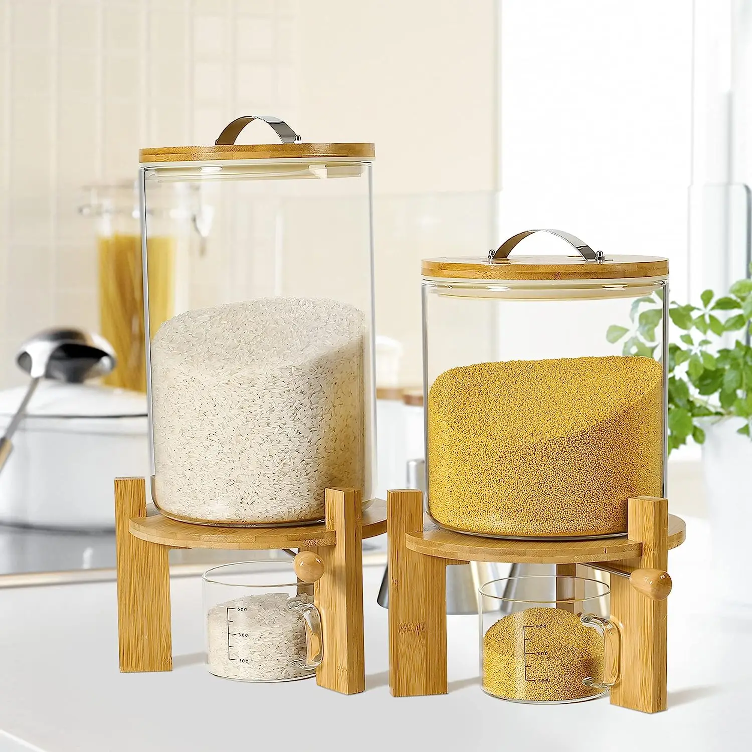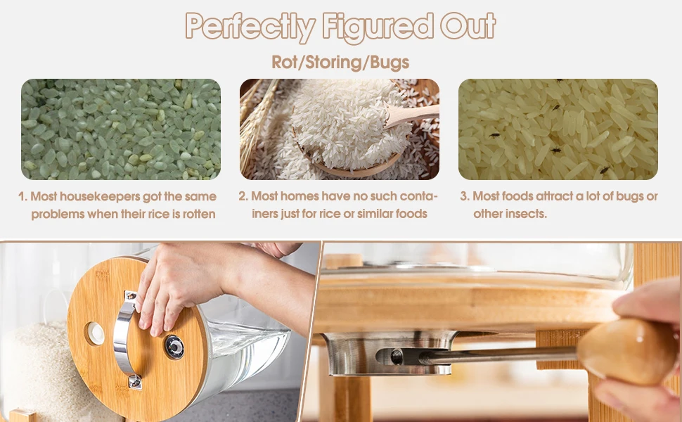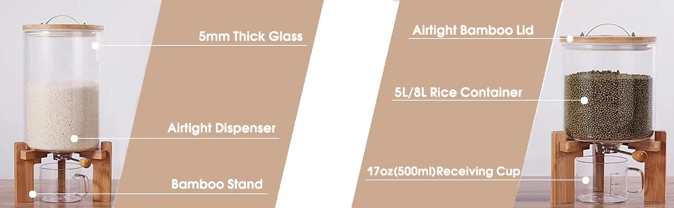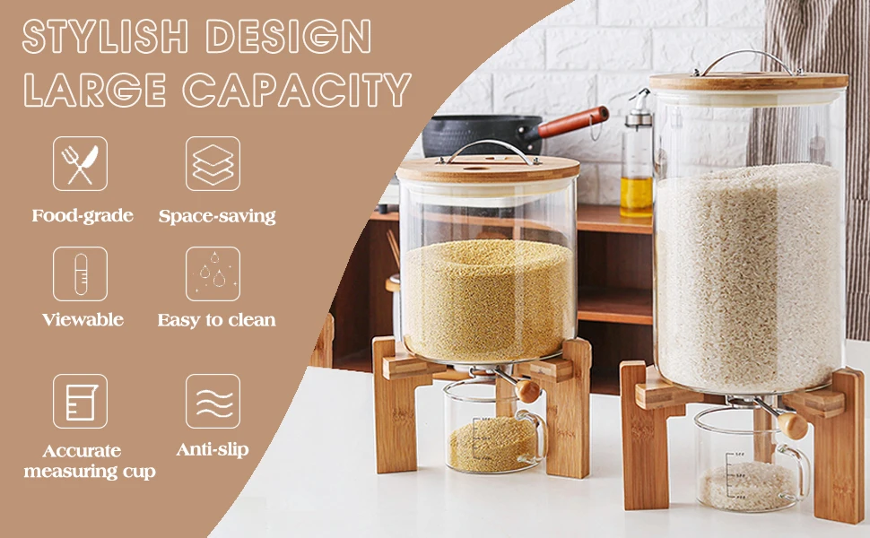 Wonder 5L 8L Airtight Automatic Glass Rice Dispenser Spout Measuring Cup with Wooden Lid Modern for Kitchen Pantry Food Storage